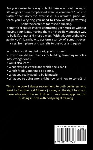 Are you looking for a way to build muscle without having to lift weights or use complicated exercise equipment? Look no further than isometric exercises! This ultimate guide will teach you everything you need to know about performing isometric exercises for muscle building. Isometric exercises involve contracting your muscles without moving your joints, making them an incredibly effective way to build strength and muscle mass. With this comprehensive guide, you'll learn how to perform a variety of isometric exercises, from planks and wall sits to push-ups and squats. In this bodybuilding diet book, you'll discover:How to use different tactics for building those tiny muscles into stronger ones You'll also learn: What exercises work; and which one's don't! Which foods you should be eating. What you really need to build muscle. What you're doing wrong right now; and how to correct it! This is the book i always recommend to both beginners who want to start their calisthenics journey on the right foot, and those who want the most direct no-nonsense approach to building muscle with bodyweight training.