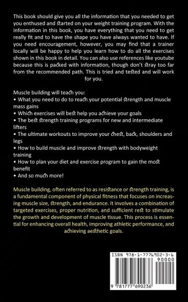 This book should give you all the information that you needed to get you enthused and started on your weight training program. With the information in this book, you have everything that you need to get really fit and to have the shape you have always wanted to have. If you need encouragement, however, you may find that a trainer locally will be happy to help you learn how to do all the exercises shown in this book in detail. You can also use references like youtube because this is packed with information, though don't stray too far from the recommended path. This is tried and tested and will work for you. Muscle building will teach you:What you need to do to reach your potential strength and muscle mass gains Which exercises will best help you achieve your goals The best strength training programs for new and intermediate lifters The ultimate workouts to improve your chest, back, shoulders and legs How to build muscle and improve strength with bodyweight training How to plan your diet and exercise program to gain the most benefit And so much more! Muscle building, often referred to as resistance or strength training, is a fundamental component of physical fitness that focuses on increasing muscle size, strength, and endurance. It involves a combination of targeted exercises, proper nutrition, and sufficient rest to stimulate the growth and development of muscle tissue. This process is essential for enhancing overall health, improving athletic performance, and achieving aesthetic goals.