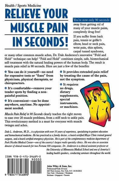 Relieve your Muscle Pain in Seconds! You're now only 90 seconds away from getting rid of many of your muscle pains, completely drug free! If you suffer from back pain, tennis or golfer's elbow, head or neck pain, wrist pain, shin splints, carpal tunnel syndrome, or many other common muscle aches, Dr. Dale Anderson's innovative "Fold and Hold" technique can help! "Fold and Hold" combines simple, safe, biomechanical self-treatment with the natural healing powers of the human body. The result is muscle pain relief in 90 seconds. Here are just a few of the benefits: * You can do it yourself--no need for expensive tests or "fixes" from physicians, physical therapists, or chiropractors. * It's comfortable--remove your tender spots by finding a non-painful position. * It's convenient--can be done anywhere, anytime. No appointment needed. * It provides extended pain relief by treating the cause of the pain, not the symptom. * It requires no drugs, dietary supplements, special instruments, or machines. Muscle Pain Relief in 90 Seconds clearly teaches the right moves to ease over 20 muscle problems, from a stiff neck to ankle pain. This revolutionary method is a must for everyone with muscle twinges and aches.