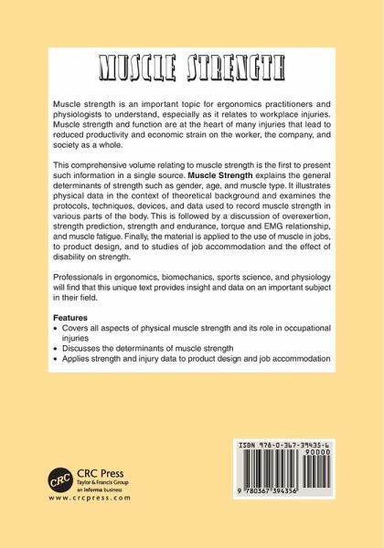 Introduction and Terminology. Physiology and Biochemistry of Strength Generation and Factors Limiting Strength Development in Skeletal Muscle. Cardiac Effects of Strength Training. Determinants of Muscle Strength. Endurance The Ability to Persist in a Physical Task. Measurement of Localized Fatigue in Biceps Brachii Using Objective and Subjective Measures. Psychophysical Aspects of Muscle Strength. Isometric, Isoinertial, and Psychophysical Strength Testing: Devices and Protocols. Isokinetic Strength Testing: Devices and Protocols. Hand and Wrist Strength. Grasp at Sub-maximal Strength. Shoulder, Elbow, and Forearm Strength. Cervical Muscle Strength. Trunk and Lifting Strength. Pushing and Pulling Strength. Design Applications of Strength Data. Electromyography and Muscle Force. Myoelectric Manifestations of Muscle Fatigue. Work Site Physical Demands analysis Methods. Job Accommodations. Strength and Disability. Gaps in Knowledge/Summary and Future Work.