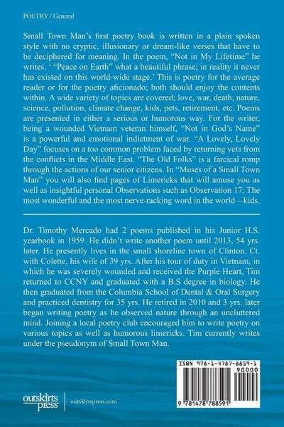 Small Town Man's first poetry book is written in a plain spoken style with no cryptic, illusionary or dream-like verses that have to be deciphered for meaning. In the poem, "Not in My Lifetime" he writes, ' "Peace on Earth" what a beautiful phrase; in reality it never has existed on this world-wide stage.' This is poetry for the average reader or for the poetry aficionado; both should enjoy the contents within. A wide variety of topics are covered; love, war, death, nature, science, pollution, climate change, kids, pets, retirement, etc. Poems are presented in either a serious or humorous way. For the writer, being a wounded Vietnam veteran himself, "Not in God's Name" is a powerful and emotional indictment of war. "A Lovely, Lovely Day" focuses on a too common problem faced by returning vets from the conflicts in the Middle East. "The Old Folks" is a farcical romp through the actions of our senior citizens. In "Muses of a Small Town Man" you will also find pages of Limericks that will amuse you as well as insightful personal Observations such as Observation 17: The most wonderful and the most nerve-racking word in the world-kids.