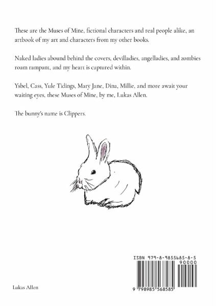 These are the Muses of Mine, fictional characters and real people alike, an artbook of my art and characters from my other books. Naked ladies abound behind the covers, devilladies, angelladies, and zombies roam rampant, and my heart is captured within. Ysbel, Cass, Yule Tidings, Mary Jane, Dina, Millie, and more await your waiting eyes, these Muses of Mine, by me, Lukas Allen. The bunny's name is Clippers.