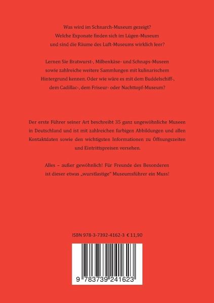 Was wird im Schnarch-Museum gezeigt? Welche Exponate finden sich im Lügen-Museum und sind die Räume des Luft-Museums wirklich leer? Lernen Sie Bratwurst-, Milbenkäse- und Schnaps-Museen sowie zahlreiche weitere Sammlungen mit kulinarischem Hintergrund kennen. Oder wie wäre es mit dem Buddelschiff-, dem Cadillac-, dem Friseur- oder Nachttopf-Museum?Der erste Führer seiner Art beschreibt 35 ganz ungewöhnliche Museen in Deutschland und ist mit zahlreichen farbigen Abbildungen und allen Kontaktdaten sowie den wichtigsten Informationen zu Öffnungszeiten und Eintrittspreisen etc. versehen.Alles - außer gewöhnlich! Für Freunde des Besonderen ist dieser etwas "wurstlastige" Museumsführer ein Muss!