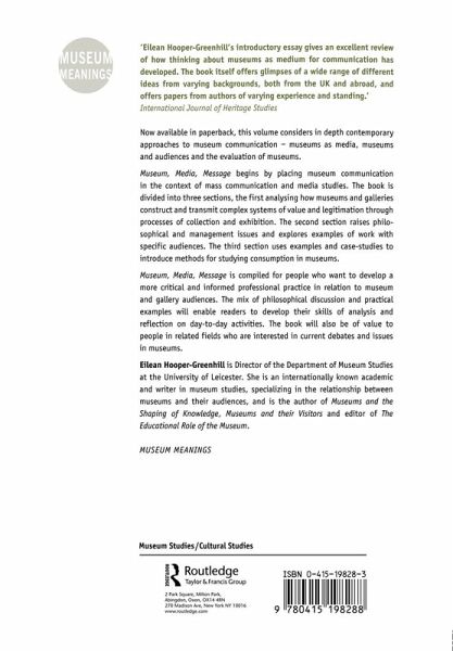 Collecting together a group of talented writers, Museum, Media, Message considers, in depth, the most up-to-date approaches to museum communication including: museums as media; museums and audience; and the evaluation of museums. Addressing the need for museums to develop better knowledge of visitor experience, this volume introduces a broad range of issues, and presents the ultimate how, why and who of museum communication. Museum, Media, Message combines philosophical discussion, practical examples and case studies and examines museum communication in three sections: analyzing how museums and galleries construct and transmit complex systems of value through processes of collection and exhibition raising philosophical and management issues and exploration of work with specific audiences introducing methods for studying the audiences' experiences of communication events in museums. Perfect for people who want to develop a more critical and informed professional museum practice, and for students looking to enhance their skills of analysis and reflection, this book is of value to anyone interested in the current debates and issues of this new and growing field.