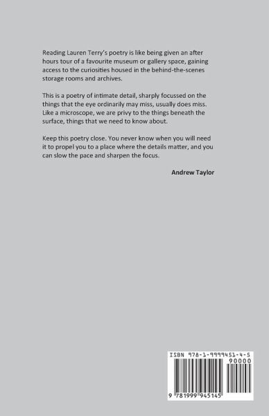 Poetry of intimate detail, sharply focussed on the things that the eye ordinarily may miss, usually does miss. Like a microscope, we are privy to the things beneath the surface, things that we need to know about. A first collection from poet Lauren Terry.