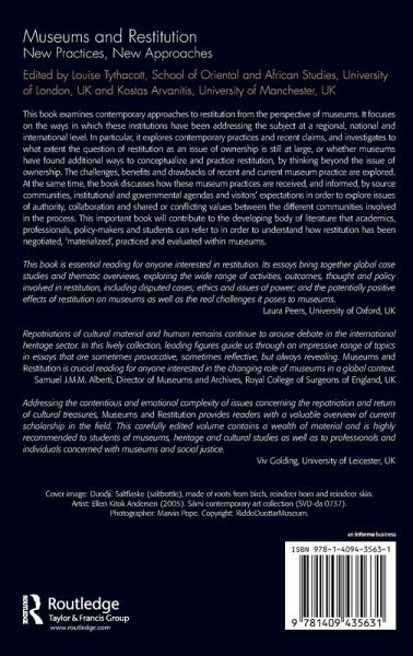Chapter 1 Museums and Restitution: An Introduction, Louise Tythacott, Kostas Arvanitis; Part I Overviews; Chapter 2 Crossing the Line: Restitution and Cultural Equity, Tristram Besterman; Chapter 3 Authority and the Power of Place: Exploring the Legitimacy of Authorized and Alternative Voices in the Restitution Discourse, Piotr Bienkowski; Part II Perspectives from Around the World; Chapter 4 Repatriation: Political Will and Museum Facilities, Eeva-Kristiina Harlin, Anne May Olli; Chapter 5 The Practice of Repatriation: A Case Study from New Zealand, Conal McCarthy; Chapter 6 'A Welcome and Important Part of their Role': The Impact of Repatriation on Museums in Scotland, Neil Curtis; Chapter 7 In Consideration of Restitution: Understanding and Transcending the Limits of Repatriation under the Native American Graves Protection and Repatriation Act (NAGPRA), Helen A. Robbins; Part III Reflections on Returns; Chapter 8 Repatriating Agency: Animacy, Personhood and Agency in the Repatriation of Ojibwe Artefacts, Maureen Matthews; Chapter 9 Debating the Restitution of Human Remains from Dutch Museum Collections: The Case of the Skulls from Urk, Demelza van der Maas; Chapter 10, Ines Katenhusen; Chapter 11 Claiming the Parthenon Marbles Back: Whose Claim and on Behalf of Whom?, Kalliopi Fouseki;