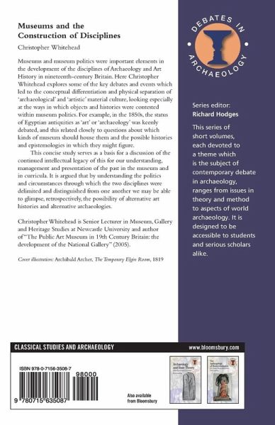 Museums and museum politics were important elements in the development of the disciplines of Archaeology and Art History in nineteenth-century Britain. Here Christopher Whitehead explores some of the key debates and events which led to the conceptual differentiation and physical separation of 'archaeological' and 'artistic' material culture, looking especially at the ways in which objects and histories were contested within museum politics. For example, in the 1850s, the status of Egyptian antiquities as 'art' or 'archaeology' was keenly debated, and this related closely to questions about which kinds of museum should house them and the possible histories and epistemologies in which they might figure. This concise study serves as a basis for a discussion of the continued intellectual legacy of this for our understanding, management and presentation of the past in the museum and in curricula. It is argued that by understanding the politics and circumstances through which the two disciplines were delimited and distinguished from one another we may be able to glimpse, retrospectively, the possibility of alternative art histories and alternative archaeologies.