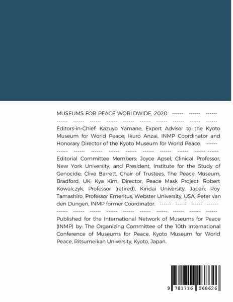 Museums for Peace Worldwide, edited by Kazuyo Yamane and Ikuro Anzai. Museums for Peace Worldwide is an international directory of over 300 museums, across 49 countries, which document tragedies of war and violence or promote the human endeavour for peace. There are descriptions of each museum - its mission, vision, exhibitions - and both geographical and internet contact details. This is a 2020 publication of the International Network of Museums for Peace (INMP). Edited by Kazuyo Yamane and Ikuro Anzai, Museums for Peace Worldwide includes an essay, "Critical Museums for Peace: Visiting Museums for Peace Worldwide", by Joyce Apsel. Editorial Committee Members: Joyce Apsel, Clinical Professor, New York University, and President, Institute for Study of Genocide; Clive Barrett, Chair of Trustees, The Peace Museum, Bradford, UK; Kya Kim, Director, Peace Mask Project; Robert Kowalczyk, Professor (retired), Kindai University, Japan; Roy Tamashiro, Professor Emeritus, Webster University, USA; Peter van den Dungen, INMP former Coordinator.