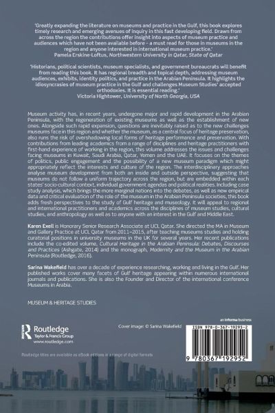 Museum activity has, in recent years, undergone major and rapid development in the Arabian Peninsula, with the regeneration of existing museums as well as the establishment of new ones. Alongside such rapid expansion, questions are inevitably raised as to the new challenges museums face in this region and whether the museum, as a central focus of heritage preservation, also runs the risk of overshadowing local forms of heritage performance and preservation. With contributions from leading academics from a range of disciplines and heritage practitioners with first-hand experience of working in the region, this volume addresses the issues and challenges facing museums in Kuwait, Saudi Arabia, Qatar, Yemen and the UAE. It focuses on the themes of politics, public engagement and the possibility of a new museum paradigm which might appropriately reflect the interests and culture of the region. The interdisciplinary approaches analyse museum development from both an inside and outside perspective, suggesting that museums do not follow a uniform trajectory across the region, but are embedded within each states' socio-cultural context, individual government agendas and political realities. Including case study analysis, which brings the more marginal nations into the debates, as well as new empirical data and critical evaluation of the role of the museum in the Arabian Peninsula societies, this book adds fresh perspectives to the study of Gulf heritage and museology. It will appeal to regional and international practitioners and academics across the disciplines of museum studies, cultural studies, and anthropology as well as to anyone with an interest in the Gulf and Middle East.