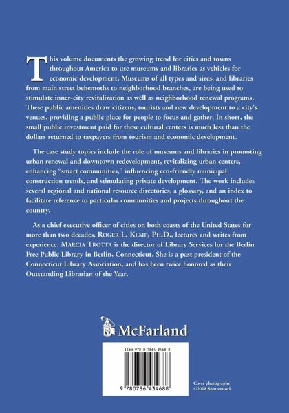 This volume documents the growing trend for cities and towns throughout America to use museums and libraries as vehicles for economic development. Museums of all types and sizes, and libraries from main street behemoths to neighborhood branches, are being used to stimulate inner-city revitalization as well as neighborhood renewal programs. These public amenities draw citizens, tourists and new development to a city's venues, providing a public place for people to focus and gather. In short, the small public investment paid for these cultural centers is much less than the dollars returned to taxpayers from tourism and economic development. This collection of essays presents case studies from Austin, Baltimore, Boston, Brooklyn, Charleston, Christchurch, Cincinnati, Denver, Des Moines, Hartford, Germantown, Indianapolis, Kansas City, Lanark, Little Rock, Memphis, Minneapolis, Miramar, Pekin, Philadelphia, Phoenix, Portland, Prince Rupert, St. Louis, St. Paul, San Jose, Seattle, Tacoma, Tallahassee, Toronto, Valencia, and Wakefield. The case study topics include the role of museums and libraries in promoting urban renewal and downtown redevelopment, revitalizing urban centers, enhancing ""smart communities,"" influencing eco-friendly municipal construction trends, and stimulating private development. The work includes several regional and national resource directories, a glossary, and an index to facilitate reference to particular communities and projects throughout the country.
