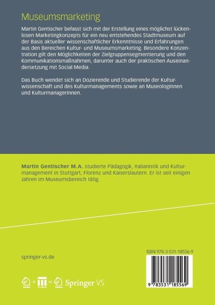 Martin Gentischer befasst sich mit der Erstellung eines möglichst lückenlosen Marketingkonzepts für ein neu entstehendes Stadtmuseum auf der Basis aktueller wissenschaftlicher Erkenntnisse und Erfahrungen aus den Bereichen Kultur- und Museumsmarketing. Besondere Konzentration gilt den Möglichkeiten der Zielgruppensegmentierung und den Kommunikationsmaßnahmen, darunter auch der praktischen Auseinandersetzung mit Social Media.