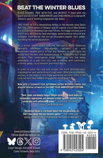 "A fascinating merging of oppressive imperialism and disconcerting alienation."--Adrian Tchaikovsky, award-winning author of Children of Time , Alien Clay & Shards of Earth Blade Runner, True Detective, and District 9 meld with the weird worlds of Jeff VanderMeer, Philip K. Dick, and China Miéville in Adrian M. Gibson's award-winning fungalpunk noir debut, now with a foreword from acclaimed author Nicholas Eames and six pieces of original interior artwork in this ONE-YEAR ANNIVERSARY EDITION. Two years after a devastating defeat in the decade-long Spore War, the island nation of Hōppon and its capital city of Neo Kinoko are occupied by invading Coprinian forces. Its fungal citizens are in dire straits, wracked by food shortages, poverty, and an influx of war refugees. Even worse, the corrupt occupiers exploit their power, hounding the native population. As a winter storm looms over the metropolis, NKPD homicide detective Henrietta Hofmann begrudgingly partners up with mushroom-headed patrol officer Koji Nameko to investigate the mysterious murders of fungal and half-breed children. Their investigation drags them deep into the seedy underbelly of a war-torn city, one brimming with colonizers, criminal gangs, racial division, and moral decay. In order to solve the case and unravel the truth, Hofmann must challenge her past and embrace fungal ways. What she and Nameko uncover in the midst of this frigid wasteland will chill them to the core, but will they make it through the storm alive? Winner of the FanFiAddict Award for Best Indie Debut and the Literary Titan Gold Book Award. SPFBO X, Indie Ink Award, American Writing Award and Readers' Favorite Book Award Finalist. "This is like nothing I've read before. Its premise is cool, creepy, and incredibly unique, bolstered by prose as savvy and knife-sharp as the detectives of the NKPD."--Nicholas Eames, award-winning author of Kings of the Wyld & Bloody Rose "This is more than a full-throttle, mushroom-and-blood-drenched adventure. At its heart, Gibson's story is one of acceptance: of hard truths, of others, and, perhaps most critically, of oneself."--M. J. Kuhn, internationally bestselling author of Among Thieves & Thick as Thieves "Dark, dank, and deeply fungal. Gibson tackles the hard topics of xenophobia, oppression, and heinous crimes against society's most vulnerable with unflinching prose."--Julia Vee, co-author of Ebony Gate & Blood Jade "Mushroom Blues is a brilliant debut that encapsulates all I love about the noir mystery genre."--R.R. Virdi, bestselling author of The First Binding & The Doors of Midnight "The imagination on display in Mushroom Blues is immense. Prepare to enter a fantasy world unlike anything you've ever seen, one that surprises, delights, and grosses the fuck out."--Moses Ose Utomi, award-winning author of The Lies of the Ajungo & The Truth of the Aleke