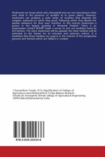 Mushroom are fungi which lack chlorophyll and can not manufacture their own food in the presence of sunlight as to green plants. However, mushroom can produce a wide range of enzymes that degrade the complex. substrate on which they grow, following which they absorb the soluble substance for their own nutrition. In this country mushroom is grown in the largest quantity in Himachal Pradesh. There is an organization named NCMRT made a survey to sort out problem faced by the farmers. The more mushroom will be popular the more facilities will be extended to the farmer for its intensive and extensive culture. It is doubtless that those facilities are urgent in the interest of the prospective growers and farmers which are millions in number.