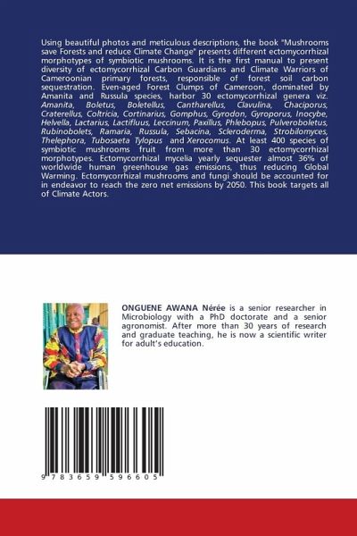 Using beautiful photos and meticulous descriptions, the book "Mushrooms save Forests and reduce Climate Change" presents different ectomycorrhizal morphotypes of symbiotic mushrooms. It is the first manual to present diversity of ectomycorrhizal Carbon Guardians and Climate Warriors of Cameroonian primary forests, responsible of forest soil carbon sequestration. Even-aged Forest Clumps of Cameroon, dominated by Amanita and Russula species, harbor 30 ectomycorrhizal genera viz. Amanita, Boletus, Boletellus, Cantharellus, Clavulina, Chaciporus, Craterellus, Coltricia, Cortinarius, Gomphus, Gyrodon, Gyroporus, Inocybe, Helvella, Lactarius, Lactifluus, Leccinum, Paxillus, Phlebopus, Pulveroboletus, Rubinobolets, Ramaria, Russula, Sebacina, Scleroderma, Strobilomyces, Thelephora, Tubosaeta Tylopus and Xerocomus. At least 400 species of symbiotic mushrooms fruit from more than 30 ectomycorrhizal morphotypes. Ectomycorrhizal mycelia yearly sequester almost 36% of worldwide human greenhouse gas emissions, thus reducing Global Warming. Ectomycorrhizal mushrooms and fungi should be accounted for in endeavor to reach the zero net emissions by 2050. This book targets all of Climate Actors.