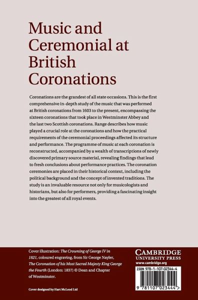 Coronations are the grandest of all state occasions. This is the first comprehensive in-depth study of the music that was performed at British coronations from 1603 to the present, encompassing the sixteen coronations that have taken place in Westminster Abbey and the last two Scottish coronations. Range describes how music played a crucial role at the coronations and how the practical requirements of the ceremonial proceedings affected its structure and performance. The programme of music at each coronation is reconstructed, accompanied by a wealth of transcriptions of newly discovered primary source material, revealing findings that lead to fresh conclusions about performance practices. The coronation ceremonies are placed in their historical context, including the political background and the concept of invented traditions. The study is an invaluable resource not only for musicologists and historians, but also for performers, providing a fascinating insight into the greatest of all Royal events.