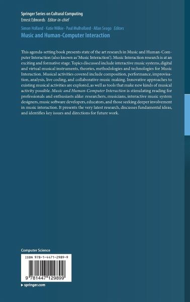 This agenda-setting book presents state of the art research in Music and Human-Computer Interaction (also known as 'Music Interaction'). Music Interaction research is at an exciting and formative stage. Topics discussed include interactive music systems, digital and virtual musical instruments, theories, methodologies and technologies for Music Interaction. Musical activities covered include composition, performance, improvisation, analysis, live coding, and collaborative music making. Innovative approaches to existing musical activities are explored, as well as tools that make new kinds of musical activity possible. Music and Human-Computer Interaction is stimulating reading for professionals and enthusiasts alike: researchers, musicians, interactive music system designers, music software developers, educators, and those seeking deeper involvement in music interaction. It presents the very latest research, discusses fundamental ideas, and identifies key issues and directions forfuture work.