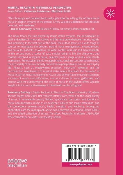 This book traces the role played by music within asylums, the participation of staff and patients in musical activity, and the links drawn between music, health, and wellbeing. In the first part of the book, the author draws on a wide range of sources to investigate the debates around moral management, entertainment, and music for patients, as well as the wider context of music and mental health. In the second part, a series of case studies bring to life the characters and contexts involved in asylum music, selected from a range of public and private institutions. From asylum bands to chapel choirs, smoking concerts to orchestras, the rich variety of musical activity presents new perspectives on music in everyday life. Aspects such as employment practices, musicians' networks and the purchase and maintenance of musical instruments illuminate the 'business' of music as part of moral management. As a source of entertainment and occupation, a means of solace and self-control, and asa device for social gatherings and contact with the outside world, the place of music in the asylum offers valuable insight into its uses and meanings in nineteenth-century England.