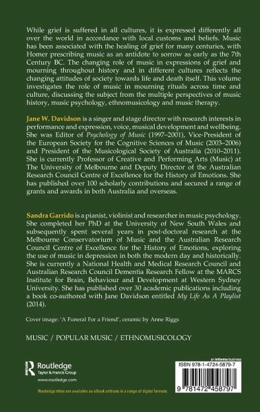 While grief is suffered in all cultures, it is expressed differently all over the world in accordance with local customs and beliefs. Music has been associated with the healing of grief for many centuries, with Homer prescribing music as an antidote to sorrow as early as the 7th Century BC. The changing role of music in expressions of grief and mourning throughout history and in different cultures reflects the changing attitudes of society towards life and death itself. This volume investigates the role of music in mourning rituals across time and culture, discussing the subject from the multiple perspectives of music history, music psychology, ethnomusicology and music therapy.