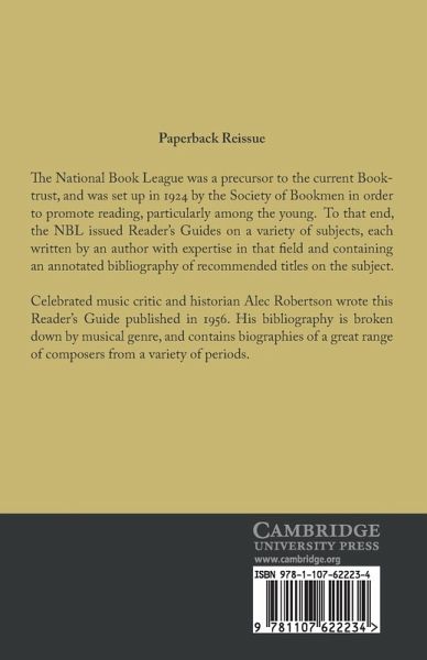The National Book League was a precursor to the current Booktrust, and was set up in 1924 by the Society of Bookmen in order to promote reading, particularly among the young. To that end, the NBL issued Reader's Guides on a variety of subjects, each written by an author with expertise in that field and containing an annotated bibliography of recommended titles on the subject. Celebrated music critic and historian Alec Robertson wrote this Reader's Guide published in 1956. His bibliography is broken down by musical genre, and contains biographies of a great range of composers from a variety of periods.