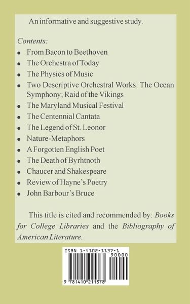 An informative and suggestive study. Contents: From Bacon to Beethoven The Orchestra of Today The Physics of Music Two Descriptive Orchestral Works: The Ocean Symphony; Raid of the Vikings The Maryland Musical Festival The Centennial Cantata The Legend of St. Leonor Nature-Metaphors A Forgotten English Poet The Death of Byrhtnoth Chaucer and Shakespeare Review of Hayne's Poetry John Barbour's Bruce This title is cited and recommended by: Books for College Libraries and the Bibliography of American Literature.