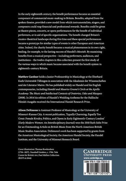 In the early eighteenth century, the benefit performance became an essential component of commercial music-making in Britain. Benefits, adapted from the spoken theatre, provided a new model from which instrumentalists, singers, and composers could reap financial and professional rewards. Benefits could be given as theatre pieces, concerts, or opera performances for the benefit of individual performers; or in aid of specific organizations. The benefit changed Britain's musico-theatrical landscape during this time and these special performances became a prototype for similar types of events in other European and American cities. Indeed, the charity benefit became a musical phenomenon in its own right, leading, for example, to the lasting success of Handel's Messiah. By examining benefits from a musical perspective - including performers, audiences, and institutions - the twelve chapters in this collection present the first study of the various ways in which music became associated with the benefit system in eighteenth-century Britain.