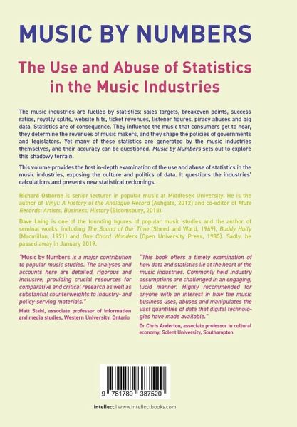 This edited collection examines statistics within the music industry. Its aim is to expose the historical and contemporary use and abuse of these numbers, both nationally and internationally. It addresses their impact on consumersâ choices, upon the careers of musicians and upon the policies that governments and legislators make.