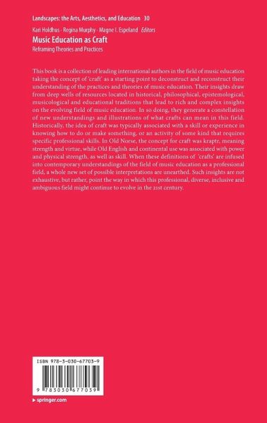 I Opening.- Craftmanship in academia: Skilled improvisation in research, teaching and leadership.- Conceptualising music education as "Craft": Responses to an invitation.- II "Music Education" as a Sustainable Craft in Society.- The craft of music teaching in a changing society.- Crafting music education for all? The composite knowledge base of music education in times of cultural diversity and social polarisation.- Music education in England as a political act: Reflections on a craft under pressure.- Educating music teachers for the future: The crafts of change.- III Music Education Practices Reframed.- The craft of music teaching in a changing society: Singing as meaning, education and craft - Reflections on Lithuanian singing practices.- Artistic citizenship and the crafting of mutual musical care.- Music listening: An evolution of craft.- The craft of (Re-)presenting musical works.- Developing craftsmanship in music education in a Palestinian refugee camp and Lebanese schools.- A creative global science classroom: Crafting the global science opera.- The craft of teaching musical improvisation improvisationally: Towards a theoretical framework.- Phronesis in music education.- Approaching vulnerability through contemporary music: The Gelland approach.- The Kraptr of aging folk musicians: Mental practice for the future.- Music education as craft: Reframing a rationale.
