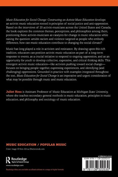 Music Education for Social Change: Constructing an Activist Music Education develops an activist music education rooted in principles of social justice and anti-oppression. Based on the interviews of 20 activist-musicians across the United States and Canada, the book explores the common themes, perceptions, and philosophies among them, positioning these activist-musicians as catalysts for change in music education while raising the question: amidst racism and violence targeted at people who embody difference, how can music education contribute to changing the social climate?
