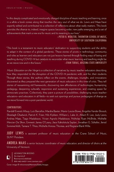 In March 2020, the COVID-19 pandemic swept the world causing physical, emotional, economic, and social upheaval in every part of the globe. It also catalyzed a renewed interrogation, by music education faculty in higher education, of philosophies and practices that had long gone unexamined. Music Education on the Verge: Stories of Pandemic Teaching and Transformative Change is a collection of narratives by music teacher-educators describing how they responded to the disruption of the COVID-19 pandemic with, and for, their students. Through these stories, the authors step back and reflect on the events, challenges, triumphs, and innovations discovered as they prepared the next generation of music educators in this time of crisis. They tell stories of reexamining old frameworks, discovering new affordances of technologies, humanizing pedagogy, deepening culturally responsive and sustaining experiences, and creating space for democratic practices. Each chapter offers examples of innovative music pedagogy that can be adapted and applied by music educators and music teacher educators with their students. Collectively, they paint a picture of possibilities, challenging music teacher-educators- and educators in all fields- to seek out openings and pursue pedagogies of change as we move forward into a post-pandemic world.