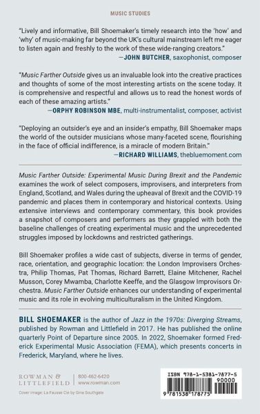 Music Farther Outside: Experimental Music During Brexit and the Pandemic examines the work of select composers, improvisers, and interpreters from England, Scotland, and Wales during the upheaval of Brexit and the COVID-19 pandemic and places them in contemporary and historical contexts. Using extensive interviews and contemporary commentary, the book provides a snapshot of composers and performers as they grappled with both the baseline challenges of creating experimental music and the unprecedented struggles imposed by lockdowns and restricted gatherings. Bill Shoemaker profiles a wide cast of subjects, diverse in terms of gender, race, orientation, and geographic location: the London Improvisers Orchestra, Philip Thomas, Pat Thomas, Richard Barrett, Elaine Mitchener, Rachel Musson, Corey Mwamba, Charlotte Keeffe, and the Glasgow Improvisors Orchestra. Music Farther Outside enhances our understanding of experimental music and its role in evolving multiculturalism.