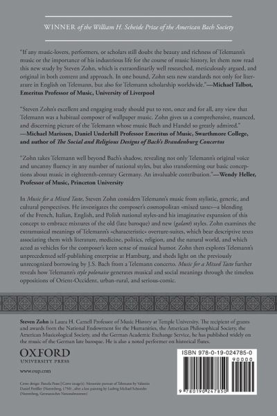 * List of Abbreviations * List of Music Examples * List of Tables * List of Figures * Prologue: Styles and Sources * Part I: The Overture-Suites * One: Acquiring a Mixed Taste: Telemann as "Great Partisan of French Music" * Two: Telemann's Mimetic Art: The Characteristic Overture-Suites * Part II: The Concertos * Three: Never from the Heart? Telemann's Concertos * Four: Bach's Debt Repaid with Interest: A Cast Study of Transformative Imitation * Part III: The Sonatas * Five: "Something for Everyone's Taste": Telemann's Sonatas to 1725 * Six: Telemann and the Sonata auf Concertenart * Part IV: The Hamburg Publications * Seven: Telemann in the Marketplace: The Composer as Self-Publisher * Eight: Telemann für Kenner und Liebhaber: The Music of the Hamburg Publications * Nine: Telemann's Polish Style and the "True Barbaric Beauty" of the Musical Other * Afterword * Glossay * Notes * Bibliography * Index of Telemann's Compositions * General Index