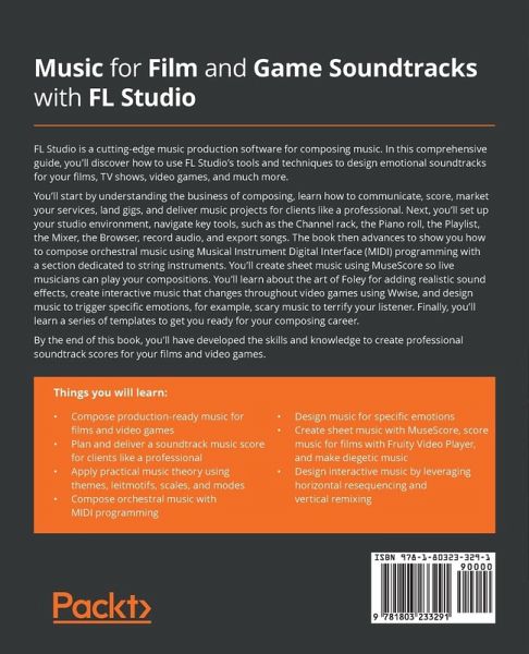 Create and compose production-quality music with the power of FL Studio 20 along with MuseScore and Wwise Key Features:Develop widely applicable music composition techniques and create full orchestral scores Leverage the power of FL Studio to create your own production-level soundtracks Use cutting-edge tools to fuel your creative ideas and launch your composer career Book Description: FL Studio is a cutting-edge software music production environment and a powerful and easy-to-use tool for composing music. In this comprehensive guide, you'll discover how to use FL Studio's tools and techniques to design exciting soundtracks for your films, TV shows, video games, and much more. You'll start by understanding the business of composing, learning how to communicate, score, market your services, land gigs, and deliver music projects for clients like a professional. Next, you'll set up your studio environment, navigate key tools, such as the channel rack, piano roll, playlist, mixer, and browser, and export songs. The book then advances to show you how to compose orchestral music using MIDI (musical instrument digital interface) programming, with a dedicated section to string instruments. You'll create sheet music using MuseScore for live musicians to play your compositions. Later, you'll learn about the art of Foley for recording realistic sound effects, create adaptive music that changes throughout video games, and design music to trigger specific emotions, for example, scary music to terrify your listener. Finally, you'll work on a sample project that will help you prepare for your composing career. By the end of this book, you'll be able to create professional soundtrack scores for your films and video games. What You Will Learn:Compose production-ready music for films and video games Plan and deliver a soundtrack music score for clients like a professional Apply practical music theory using themes, leitmotifs, scales, and modes Compose orchestral music with MIDI programming Design music for specific emotions Create sheet music with MuseScore, score music for films with Fruity Video Player, and make diegetic music Design interactive music by leveraging horizontal resequencing and vertical remixing Who this book is for: This book is for musicians and programmers who want to take their music composing skills to a professional level. Film directors and game designers who want to get involved in scoring music for their own productions will also find this book useful. All you need is a computer and FL Studio to get started.