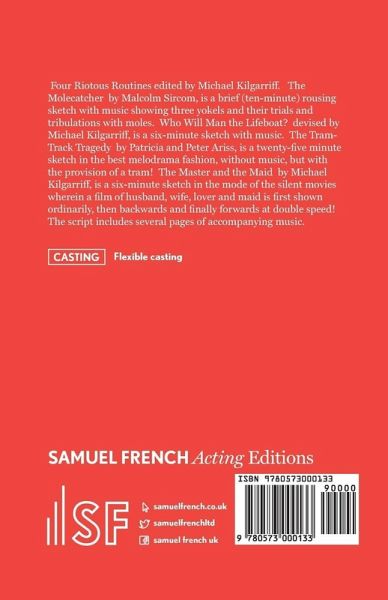 Four Riotous Routines edited by Michael Kilgarriff. The Molecatcher by Malcolm Sircom, is a brief (ten-minute) rousing sketch with music showing three yokels and their trials and tribulations with moles. Who Will Man the Lifeboat? devised by Michael Kilgarriff, is a six-minute sketch with music. The Tram-Track Tragedy by Patricia and Peter Ariss, is a twenty-five minute sketch in the best melodrama fashion, without music, but with the provision of a tram! The Master and the Maid by Michael Kilgarriff, is a six-minute sketch in the mode of the silent movies wherein a film of husband, wife, lover and maid is first shown ordinarily, then backwards and finally forwards at double speed! The script includes several pages of accompanying music. Flexible casting