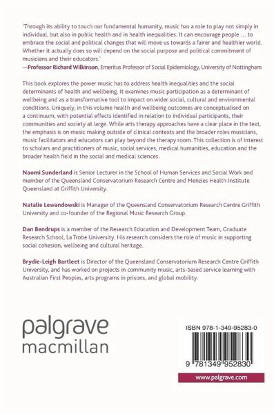 Chapter 1. Introduction; Naomi Sunderland, Natalie Lewandowski, Dan Bendrups, Brydie-Leigh Bartleet.- Chapter 2. Music, public health, and health promotion: Can music be a social determinant of health?; Donald Stewart and Yoon Irons.- Chapter 3; Social and applied psychological explorations of music, health and well-being; Jane Davidson and Amanda Krause.- Chapter 4. Promoting social inclusion, equity and well-being for young people with Autism Spectrum Condition: A community music facilitator (and parent) perspective; Michael Wheelan.- Chapter 5. Depression and music: Approaching health equity through therapeutic choir singing; Kirsten Robertson-Gillam.- Chapter 6. Health and well-being benefits of singing for older people; Stephen Clift, Rebekah Gilbert, and Trish Vella-Burrows.- Chapter 7. Community music research and evaluation through a social determinants lens; Naomi Sunderland, Lauren Istvandity, Ali Lakhani, and Caroline Lennette.- Chapter 8. 'Being here': Equity through musical engagement with people with Dementia; Rineke Smilde.- Chapter 9. Rama and the Worm: A performance-based approach to health promotion in rural Indonesia; Dan Bendrups, Donald Stewart, and Joko Susilo.- Chapter 10. Community arts, employment and poverty: Exploring the roles of musical participation and professionalisation in health equity; Klisala Harrison.- Chapter 11. How can arts participation promote Indigenous social determinants of health?; Brydie-Leigh Bartleet, Naomi Sunderland, and Ali Lakhani.- Chapter 12. Achieving health equity and social justice through music: Music as a global resource; Barbara Hesser and Harry N. Heinemann.- Chapter 13; Medical ethnomusicology and the promise of music, health and healing; Benjamin D. Koen.- Chapter 14. Weapons of mass happiness: Social justice and health equity in the context of the arts; Clive Parkinson.