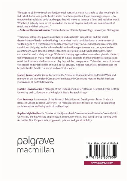 Chapter 1. Introduction; Naomi Sunderland, Natalie Lewandowski, Dan Bendrups, Brydie-Leigh Bartleet.- Chapter 2. Music, public health, and health promotion: Can music be a social determinant of health?; Donald Stewart and Yoon Irons.- Chapter 3; Social and applied psychological explorations of music, health and well-being; Jane Davidson and Amanda Krause.- Chapter 4. Promoting social inclusion, equity and well-being for young people with Autism Spectrum Condition: A community music facilitator (and parent) perspective; Michael Wheelan.- Chapter 5. Depression and music: Approaching health equity through therapeutic choir singing; Kirsten Robertson-Gillam.- Chapter 6. Health and well-being benefits of singing for older people; Stephen Clift, Rebekah Gilbert, and Trish Vella-Burrows.- Chapter 7. Community music research and evaluation through a social determinants lens; Naomi Sunderland, Lauren Istvandity, Ali Lakhani, and Caroline Lennette.- Chapter 8. 'Being here': Equity through musical engagement with people with Dementia; Rineke Smilde.- Chapter 9. Rama and the Worm: A performance-based approach to health promotion in rural Indonesia; Dan Bendrups, Donald Stewart, and Joko Susilo.- Chapter 10. Community arts, employment and poverty: Exploring the roles of musical participation and professionalisation in health equity; Klisala Harrison.- Chapter 11. How can arts participation promote Indigenous social determinants of health?; Brydie-Leigh Bartleet, Naomi Sunderland, and Ali Lakhani.- Chapter 12. Achieving health equity and social justice through music: Music as a global resource; Barbara Hesser and Harry N. Heinemann.- Chapter 13; Medical ethnomusicology and the promise of music, health and healing; Benjamin D. Koen.- Chapter 14. Weapons of mass happiness: Social justice and health equity in the context of the arts; Clive Parkinson.