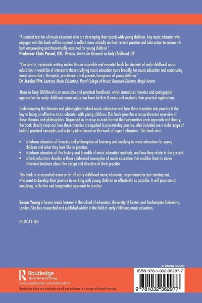 "In this scholarly, theoretically focused and immensely practical book Susan Young has succeeded in creating what I believe will be a seminal text for all music educators who are developing their praxis with young children. Despite the rapid developments in the practice of music education for the young child over the last three decades, stimulated in no small part by Susan herself, there has been a yawning gap in accessible texts which set out clearly the underpinning theory and philosophy that is essential to ensure critical and reflective music practice. This book fills that gap beautifully and powerfully. Susan has carefully selected, evaluated and curated a collection of the key theories and philosophies which have underpinned music education practice over time, and made a critical case for their relevance to contemporary early childhood music education. This book provides a new and original vehicle to inform and deepen the delicate of art of effective music education praxis. I believe any music educator who engages with this book will be inspired and motivated to reflect more critically on their current practice and take action to ensure it is both empowering and theoretically executed for the young children at the centre of their music making."