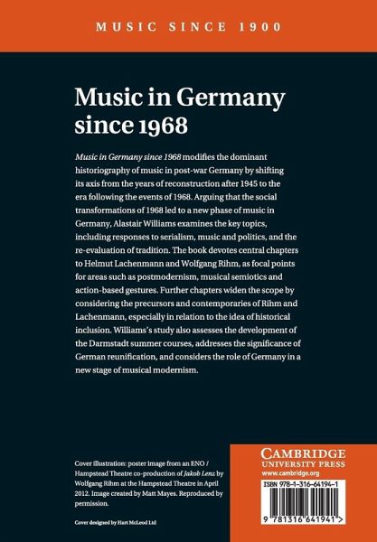 Music in Germany since 1968 modifies the dominant historiography of music in post-war Germany by shifting its axis from the years of reconstruction after 1945 to the era following the events of 1968. Arguing that the social transformations of 1968 led to a new phase of music in Germany, Alastair Williams examines the key topics, including responses to serialism, music and politics, and the re-evaluation of tradition. The book devotes central chapters to Helmut Lachenmann and Wolfgang Rihm, as focal points for areas such as postmodernism, musical semiotics and action-based gestures. Further chapters widen the scope by considering the precursors and contemporaries of Rihm and Lachenmann, especially in relation to the idea of historical inclusion. Williams's study also assesses the development of the Darmstadt summer courses, addresses the significance of German reunification, and considers the role of Germany in a new stage of musical modernism.