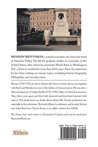 Mozart (1759-1791), in whose shadow Mr. Varon is shown above, was (together with Bach and Beethoven) one of the fathers of classical music. He was also a full contemporary of Adam Smith (1723-1790), father of classical economics.They died a year apart, and they both deserved and have been honored with statues. This book leaves no doubt about where Mr. Varon's preferences lie, especially in his retirement. The book follows in substance and in spirit his last one titled Book Love: Twelve Essays on an Affair without End (2018). Mr. Varon lives and writes in Alexandria, Virginia and can be reached at Benvaron@aol.com