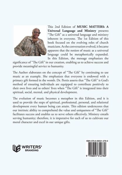 This 2nd Edition of MUSIC MATTERS: A Universal Language and Ministry presents "The Gift" as a universal language and ministry inherent in everyone. The 1st Edition of this book focused on the evolving roles of church musicians. As the conversation evolved, it became apparent that the notion of music as a universal language could be metaphorically expanded. In this Edition, the message emphasizes the significance of "The Gift" in our creation, enabling us to achieve success and provide meaningful service to humanity. The Author elaborates on the concept of "The Gift" by continuing to use music as an example. She emphasizes that everyone is endowed with a primary gift formed in the womb. Dr. Portis asserts that "The Gift" is God's method of ensuring individuals are equipped to contribute positively to their own lives and to others' lives when "The Gift" is integrated into their spiritual, social, mental, and physical development. The evolution of music becomes a metaphor in this Edition, and it is used to provide the steps of spiritual, professional, personal, and relational development every human being can attain. This edition underscores that our intrinsic ability to comprehend the value and uniqueness of "The Gift" facilitates success and enables us to serve others effectively. Ministry entails serving humanity; therefore, it is imperative for each of us to cultivate our moral character and excel in our unique gifts.