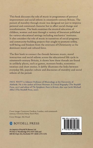 This book discusses the role of music in programmes of personal improvement and social reform in nineteenth-century Britain. The pursuit of morality through music was designed not just to improve personal and communal character but to affect social change and transformation. The book examines the musical education of children, women and men through a variety of literature published for various educational settings including mechanics' institutes. It also considers the role of music in narratives of social programs and community-building projects that sought to promote utility, well-being and freedom from the strictures of Christianity as the dominant moral and cultural force. The first book to connect the threads between music, moral instruction and social reform across the educational life cycle in nineteenth-century Britain, it shows how these threads are found in unlikely places, such as games, manners books, economics treatises and short stories. It deftly illustrates the links between everyday life, popular culture and discourses of morality and social reform of the period.
