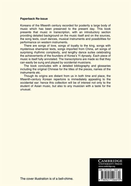 Koreans of the fifteenth century recorded for posterity a large body of music which has been preserved to the present day. This book presents that music in transcription, with an introductory section providing detailed background on the music itself and on the sources, the song texts, court dances, musical instruments and possibilities for performance on western instruments. The fact that the song texts are translated makes this the largest published anthology of early Korean verse in translation. The book concludes with a detailed bibliography and glossaries including the original Chinese for the titles of the pieces, names of the instruments, etc. Though its origins are distant from us in both time and place, the fifteenth-century Korean repertoire is immediately appealing to the occidental ear: hence this collection will be of interest not only to the student of Asian music but also to any musician with a taste for the unusual.