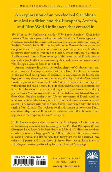 The Music of the Netherlands Antilles: Why Eleven Antilleans Knelt before Chopin's Heart is not your usual musical scholarship. In October 1999, eleven Antilleans attended the service held to commemorate the 150th anniversary of Frédéric Chopin's death. This service, held in the Warsaw church where the composer's heart is kept in an urn, was an opportunity for these Antilleans to express their debt of gratitude to Chopin, whose influence is central to Antillean music history. Press coverage of this event caused Dutch novelist and author Jan Brokken to start writing this book, based on notes he took while living on Curaçao from 1993 to 2002. Anyone hoping to discover an overlooked chapter of Caribbean music and music history will be amply rewarded with this Dutch-Caribbean perspective on the pan-Caribbean process of creolization. On Curaçao, the history and legacy of slavery shaped culture and music, affecting all of the New World. Brokken's portraits of prominent Dutch Antillean composers are interspersed with cultural and music history. He puts the Dutch Caribbean's contributions into a broader context by also examining the nineteenth-century works by pianist Louis Moreau Gottschalk from New Orleans and Manuel Saumell from Cuba. Brokken explores the African component of Dutch Antillean music--examining the history of the rhythm and music known as tambú as well as American jazz pianist Chick Corea's fascination with the tumba rhythm from Curaçao. The book ends with a discussion of how recent Dutch Caribbean adaptations of European dance forms have shifted from a classical approach to contemporary forms of Latin jazz.