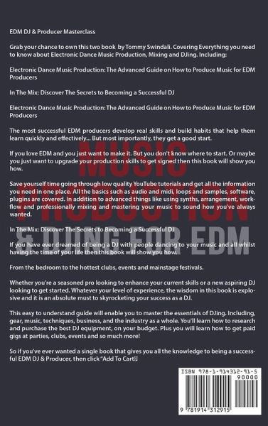 EDM DJ & Producer Masterclass Grab your chance to own this two book bundle by Tommy Swindali. Covering Everything you need to know about Electronic Dance Music Production, Mixing and DJing. Including: Electronic Dance Music Production: The Advanced Guide on How to Produce Music for EDM Producers In The Mix: Discover The Secrets to Becoming a Successful DJ Electronic Dance Music Production: The Advanced Guide on How to Produce Music for EDM Producers Why do some producers make great music after just one year, while others still sound average? The answer? It's how they learn and practice. Save yourself time going through low quality YouTube tutorials and get all the information you need in one place. All the basics such as audio and midi, loops and samples, software, plugins are covered. In addition to advanced things like using synths, arrangement, workflow and professionally mixing and mastering your music to sound how you've always wanted. In The Mix: Discover The Secrets to Becoming a Successful DJ If you have ever dreamed of being a DJ with people dancing to your music and all whilst having the time of your life then this book will show you how. From the bedroom to the hottest clubs, events and mainstage festivals. Whether you're a seasoned pro looking to enhance your current skills or a new aspiring DJ looking to get started. Whatever your level of experience, the wisdom in this book is explosive and it is an absolute must to skyrocketing your success as a DJ. This easy to understand guide will enable you to master the essentials of DJing. So if you've ever wanted a single book that gives you all the knowledge to being a successful EDM DJ & Producer, then Read This Book