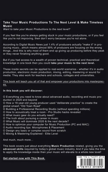 Take Your Music Productions To The Next Level & Make Timeless Music Want to take your Music Productions to the next level? If you feel like you're always getting stuck in your music productions, or if you feel like you're not improving, then don't worry because you're not alone. According to Digital Music News just 1.4% of producers actually "make it" in producing music...which means almost 99% of producers are focusing on the wrong things...And this is why most of them end up giving up producing before they peak or they never finishing anything good. But if you had access to a wealth of proven technical, practical and theoretical knowledge in one book then you could take your music to the next level. These inside secrets can be applied to real-world scenarios - whether it's in audio production, electronic music production, mixing, editing, mastering or sound for media. They also work for teachers and schools, colleges and universities. This book will teach you all of that and empower your productions into masterpieces. In this book you will discover:Everything you need to know about advanced audio, recording and music production in 2020 and beyond How a 19-year-old young producer used "deliberate practice" to create the global smash "Old Town Road" Building a Professional Recording Studio (without spending millions) How to acoustically treat a room - Pro Studio hacks revealed What music gear do you actually need? The truth about pursuing a career in music What Music will dominate 2020 & the next decade? How to optimize your computer for Music Production (PC and MAC) Audio recording tips: Microphones & Placement Design any basic or complex sound from scratch Mixing & Mastering Explained - Elite Level And much, much more... This book covers just about everything Music Production related, giving you the advanced skills required by today's global music industry. And if you take the time to apply the knowledge inside then your music will elevate to a whole new level! Get started now with This Book.
