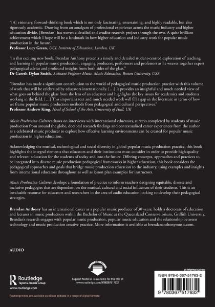 - "This is an outstanding book that makes a significant contribution to popular music pedagogy, music production studies and praxes, and popular music studies. Brendan Anthony's book is novel in its research design, methodologically collaborative, comprehensive in scope, and presents useful findings that may be realistically implemented in contemporary music pedagogies. The book draws upon original primary research which lends it novel dimensions and an informed authority that comes from the incorporation of student and contributor perspectives as well as those of the author."
