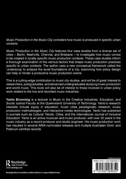 Music Production in the Music City considers how music is produced in specific urban contexts, and features four case studies from a diverse set of cities - Berlin, Nashville, Chennai, and Brisbane - to investigate how music comes to be created in locally specific music production contexts.