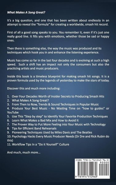 What Makes A Song Great? It's a big question, and one that has been written about endlessly in an attempt to reveal the "formula" for creating a worldwide, smash hit record. First of all a good song speaks to you. You remember it, even if it's just one really good line...It fills you with emotions, whether those be sad or happy ones. Then there is something else..., it's the way the music was produced and its techniques which hook you in and enhance the listening experience. Music has come so far in the last four decades and is evolving at such a high speed. Such a shift has impacted not only the consumers but also the practicing artists and music producers. Inside this book you will find a timeless blueprint for making smash hit songs. It is a proven formula used by the legends of yesterday to make the stars of today. Discover this and much more including: Over Four Decades Worth of Insider Secrets to Producing Smash Hits What Makes A Song Great? From Then to Now - Trends & Techniques in Popular Music Produce Your Best Music - No More Wasting Time on "How to Guides" or YouTube Use This "Step by Step" Guide to Identify Your Favorite Production Techniques Learn What Makes a Bad Mix and How to Avoid It The Proven Way to Put More Feeling into Your Music with Technology Tips for The Best Band Rehearsals & Recordings Pioneering Techniques Used by Miles Davis, The Beatles & More Psychology Hacks Every Music Producer Needs (Dr Dre and Rick Rubin Do This) Workflow Tips In a "Do it Yourself" Culture And much, much more... The road that led music to where it is today is laden with history which you can learn from to make your best music. Whether you are an aspiring Music Producer or an expert in this field you can start from where you are and master the art of music production and songwriting. So if your ready to discover make your best music then scroll up and click "add to cart"
