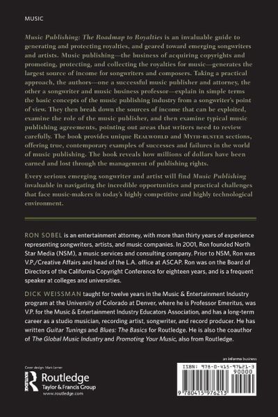 Ron Sobel is an attorney and the founder/president of North Star Media, a music publishing administration and consulting company based in Studio City, California. NSM is actively engaged in representing writers and their catalogues to the film and television community. Sobel is a former Vice President of ASCAP, the leading society representing composers. Dick Weissman is the most published American author on the music business. He has written four books about the music industry. He taught for twelve years in the Music & Entertainment Industry program at the University of Colorado at Denver, was VP for the Music & Entertainment Industry Educators Association, and has a long-term career as a studio musician, recording artist, songwriter and record producer. His book The Music Industry; Career Opportunities, Self Defense, is currently in its 4th edition.