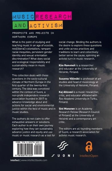 Kim Ramstedt is a researcher and educator at the University of Helsinki, Finland. Susanna Välimäki is professor of art studies and head of musicology at the University of Helsinki, Finland. Sini Mononen is an Academy Research Fellow (Research Council of Finland) at the University of Helsinki, Finland. Kaj Ahlsved is a music researcher, critic, and educator affiliated with Åbo Akademi University in Turku, Finland. They are all founding members of Suoni, a research association for activist music research.