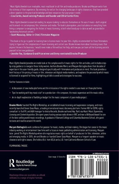 Music Rights Unveiled provides an inside look at the complex world of music rights for film and video and includes step-by-step guidance to navigate these tricky waters. Authors Brooke Wentz and Maryam Battaglia share their decades of expertise in this user-friendly guide, designed specifically with filmmakers and producers in mind. The book provides a brief history of the pricing of music in film, television and digital media markets, and explains the process by which music is licensed or acquired for films, highlighting pitfalls to avoid and strategies for success. Further features include: A discussion of new media platforms and the intricacies of the rights needed to use music on those platforms; Tips for working with key music staff on a production - the Composer, the Music Supervisor and the Music Editor; An in-depth explanation of building a budget for the music component of your media project.